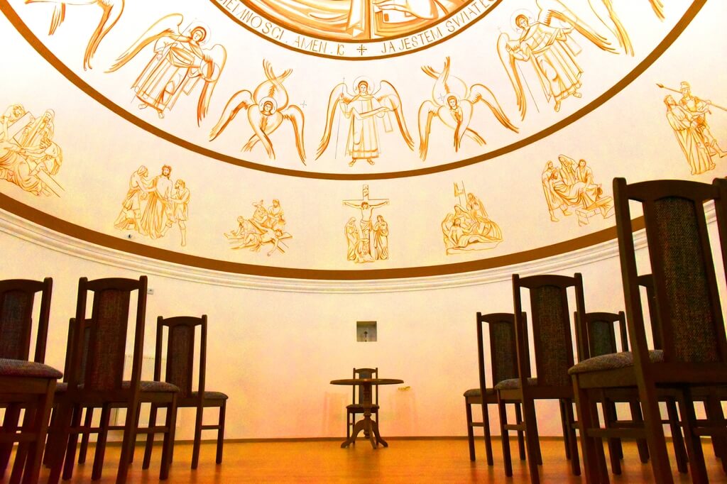 W budynku znajduje się przepiękna Kaplica, wyróżniająca się półkolistym sklepieniem o średnicy 8 metrów. To wyjątkowe miejsce łączy w sobie harmonię architektury i spokój, tworząc przestrzeń do refleksji i modlitwy.